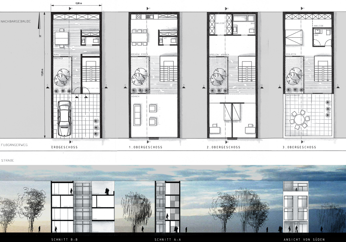 Bei dem zu bebauenden Grundstück handelt es sich um eine Grenzbebauung. Nur an der straßenseitig gelegenen Südfassade sind Fensteröffnungen gestattet. Das Gebäude, bei welchem maximal vier Geschosse und ein Staffelgeschoss zulässig ist, soll Wohnen einer vierköpfigen Familie und eine Bürofläche ermöglicht werden. Der Standort befindet sich in einer südeuropäischen Metropole. Das langgestreckte Baukörpervolumen wurde in drei Bereiche untergliedert. Um der Problematik der Belichtung entgegenzuwirken wurde ein Innenhof/ „Lichtschacht" eingestellt und ein großzügiges Oberlicht über der Erschließungszone platziert. Im südlichen Gebäudeteil befinden sich die Wohnräume. Schiebeelemente an der Südfassade sorgen in den Sonnenstunden für die nötige Verschattung. Über einen Steg, zwischen Erschließung und Innenhof, werden die Nebenräume mit den Wohnräumen verbunden. Die Nebenräume im nördlichen Gebäudeteil werden über den Innenhof belichtet/ belüftet. Des Weiteren erfolgt die Belichtung hier über das offene Treppenhaus, welches durch seine Konstruktion zugleich die Wände mit einem Licht- und Schattenspiel schmückt.