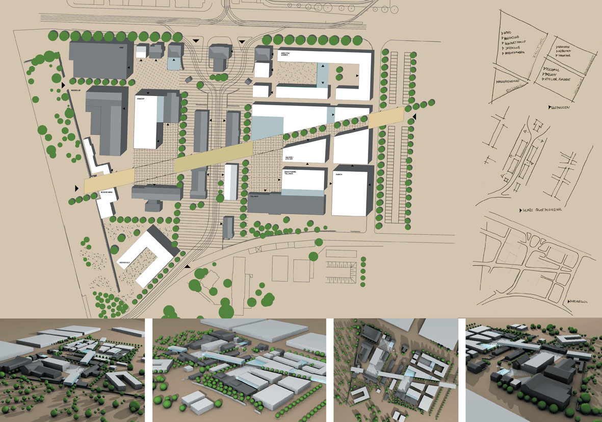Das ehemalige Schlacht- und Viehhofgelände in Karlruhe, auf welchem sich zahlreiche denkmalgeschützte Gebäude befinden, soll zu einem vielfältigen kreativen Ausbildungsgebiet umgenutzt werden. Ziel ist es kulturelle Nutzungen in einer inspirierenden Atmosphäre zu errichten, qualitative Außenräume zu schaffen, und eine Verknüpfung von Wohnen und Arbeiten zu erzielen. Der inselartige Charakter des Areals wird an einigen Punkten aufgebrochen. Etwa mit einer Wegeführung, welche sich diagonal durch das gesamte Areal zieht. Diese "Diagonale" verbindet die Grünanlage von Schloss Gottesaue mit dem Messplatz. Die Erschließung führt über zwei Platzanlagen und kreuzt die bereits bestehende Erschließungsgasse. Gebäudevolumen sind entlang der "Diagonale" über die historischen Gebäude gelagert und bilden das „Land- Mark" des ehemaligen Schlacht- und Viehhofgeländes. Nach Süden hin öffnet sich das Areal vollständig. Westlich der bestehenden Erschließungsgasse gelegen sind Kino, Musikclub, Konzerthalle, Jazzclub und Medienfabrik. Östlich davon fasst eine Blockrandbebauung Wohnen und Arbeiten. Diese gelagert um eine introvertierte Hofanlage. Südlich davon eine Erweiterung des Kulturzentrums „Tollhaus", sowie Ateliers.