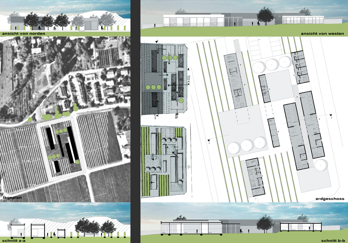 In einem ländlichen Kontext, in unmittelbarer Nachbarschaft zu einem Weinbaudorf, soll ein Haus für den Wein erstellt werden. Das Grundstück ist umgeben von Weinbergen, die von dem Winzer des Weinguts bewirtschaftet werden. Architektonisch soll ein Gebäude entwickelt werden, das im attraktiven landschaftlichen Gefüge, zum einen als Land- Mark wirkt, gleichzeitig auch als besonderes architektonisches Zeichen für die Nutzung Weinbau lesbar wird. Die Gebäudekomplexe fügen sich der Struktur der Weinrebenzeilen, sie wachsen aus dem Weinberg empor. Das bereits vorhandene Land- Mark "Weinberg" bleibt somit als solches erhalten. Zwischen den "Gebäudezeilen" und Weinrebenzeilen entstehen kleine Außenräume. Die Gebäudefassaden, die massiven Elemente, sind den Trockenmauern aus dem Weinbergbau nachempfunden. Sie erhalten in Beton gefasste Natursteine der Region. Wie auch der Wein müssen sie reifen und gewinnen an Qualität mit der entstehenden Patinaschicht. Im Kontrast dazu stehen transparente großformatige Fassadenflächen, welche sich zu den Weinrebenzeilen hin öffnen.