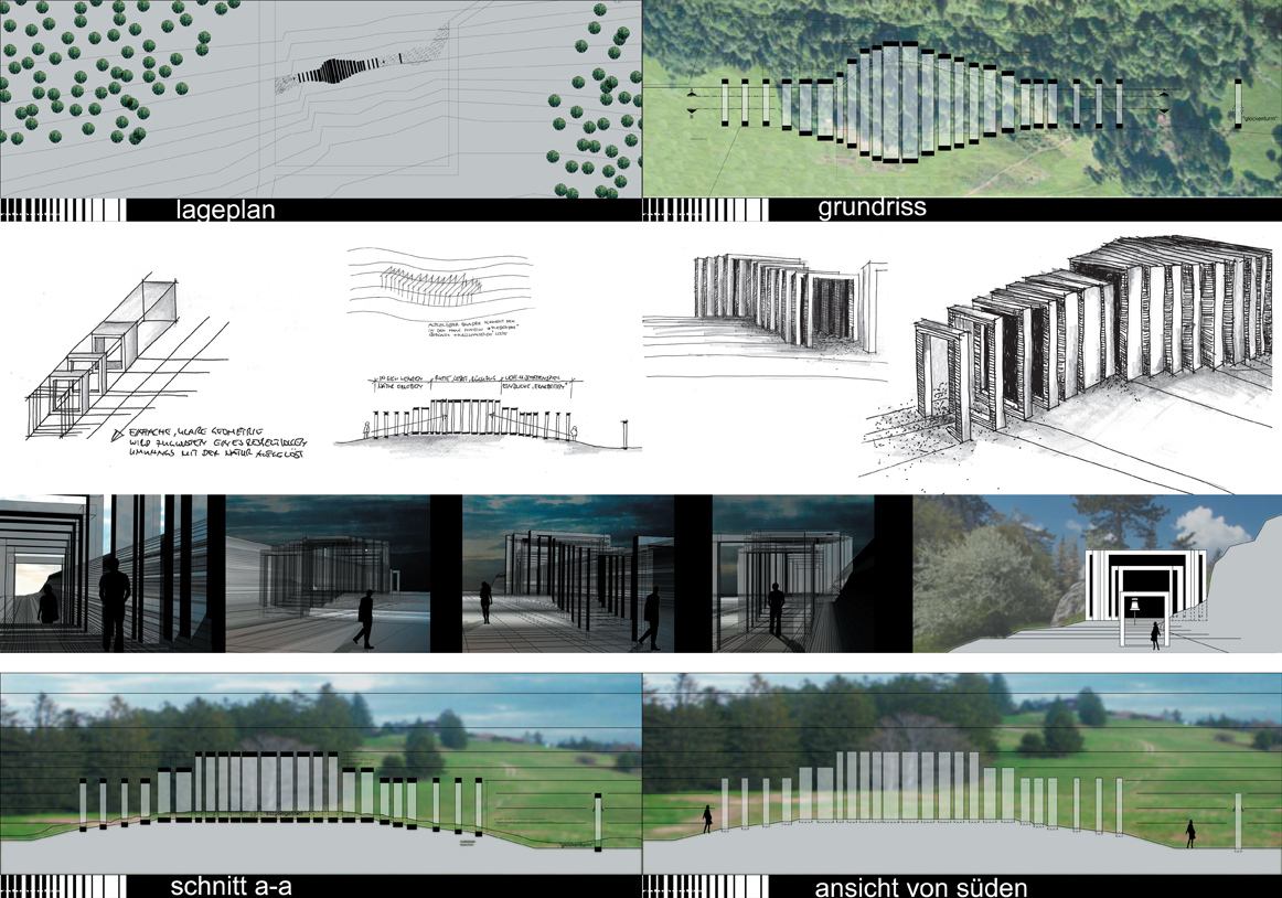 Das Grundelement bildet ein Quader, da er wohl die einfachste und klarste geometrische Form darstellt, und die angestrebte Zurückhaltung beim Entwurf der Kapelle widerspiegelt. Für einen respektvollen Umgang mit der Natur/ Umgebung wird durch Auflösung des Quaders reagiert. Die einzelnen Rahmen/ Tore schmiegen sich an den Hang an, sie lassen die Natur „weiterfließen". Im Innenraum bleibt der Hang ebenfalls teilweise erhalten um dem Besucher die Natur erfahren zu lassen, und zudem eine Sitzgelegenheit bietet.