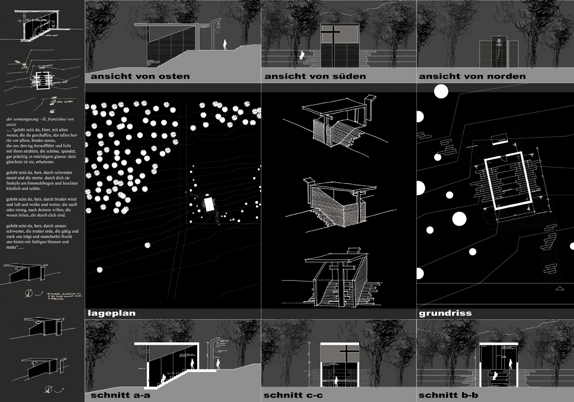 In einem ländlichen Kontext in Bayern mit Sicht auf die Alpenkulisse soll eine christliche Kapelle errichtet werden. Sie soll dem heiligen Franziskus von Assisi geweiht werden und allen Menschen, gleich welchen Bekenntnisses, offen stehen. Es soll ein spezifischer Raum entwickelt werden, dessen Charakteristika sich aus Ort und Thema herleiten. ...."wenn du vollkommen sein willst, geh, verkauf deinen Besitz und gib das Geld den Armen; so wirst du einen bleibenden Schatz im Himmel haben; dann komm und folge mir nach." (Mt 19,21).... Die Kapelle „schiebt" sich samt Außenraumgestaltung mit würdigen Abstand zur Natur den Hang hinauf. Der Besucher kann die Natur bewusst erleben wenn er den Weg hinauf/ herab zur Kapelle auf sich nimmt. Zum Verweilen sollen die Treppenstufen ebenfalls einladen. Wenn sich der Besucher der Kapelle nähert sieht er das „Symbol" immerzu, gleich welchen Standpunkt er einnimmt. Immer wieder neue Situationen ergeben sich durch den Hintergrund „Himmel". ..."Franziskus beeindruckte, dass Gott "herunterkommt" in diese Welt und in Jesus Christus Mensch wird. Diesen "Abstieg" wollte Franziskus nachvollziehen und Jesus in seiner Demut und Armut nachfolgen...." Die Treppenstufen verschmelzen mit der Erde, die Sitzstufen mit den Treppenstufen. Ein „Teppich" legt sich auf die Erde. Wenn der Besucher in die Kapelle eintritt kann er weit ins Tal schauen und die Natur erleben. Je weiter er nach unten zum Altar schreitet, umso „ruhiger" wird der Raum. Eine weitere Möglichkeit, Kirche lebendig zu erleben, bietet das Läuten der Glocke mittels Beiers. An den Klöppel werden Seile gebunden und bis kurz vor die Glockenwandung arretiert. Auf der Glocke befindet sich das Zeichen Tau. Franziskus verwendete das Zeichen oft. Er zeichnete es auf Häuser, Wände und Bäume. Die Stahlbetonscheiben sind in Sichtbetonqualität. Der Beton wird dann später von der Natur eingenommen und eine Patina bildet sich. Die Wandscheiben mit saugenden Schalungsoberflächen ergeben raue, porenfreie und dunklere erscheinende Betonoberflächen. Die glatten Schalungsoberflächen lassen die fertigen Betonoberflächen bei gleicher Betonrezeptur heller erscheinen, womit dann der Innenraum und die Dachscheibe gestaltet werden soll.